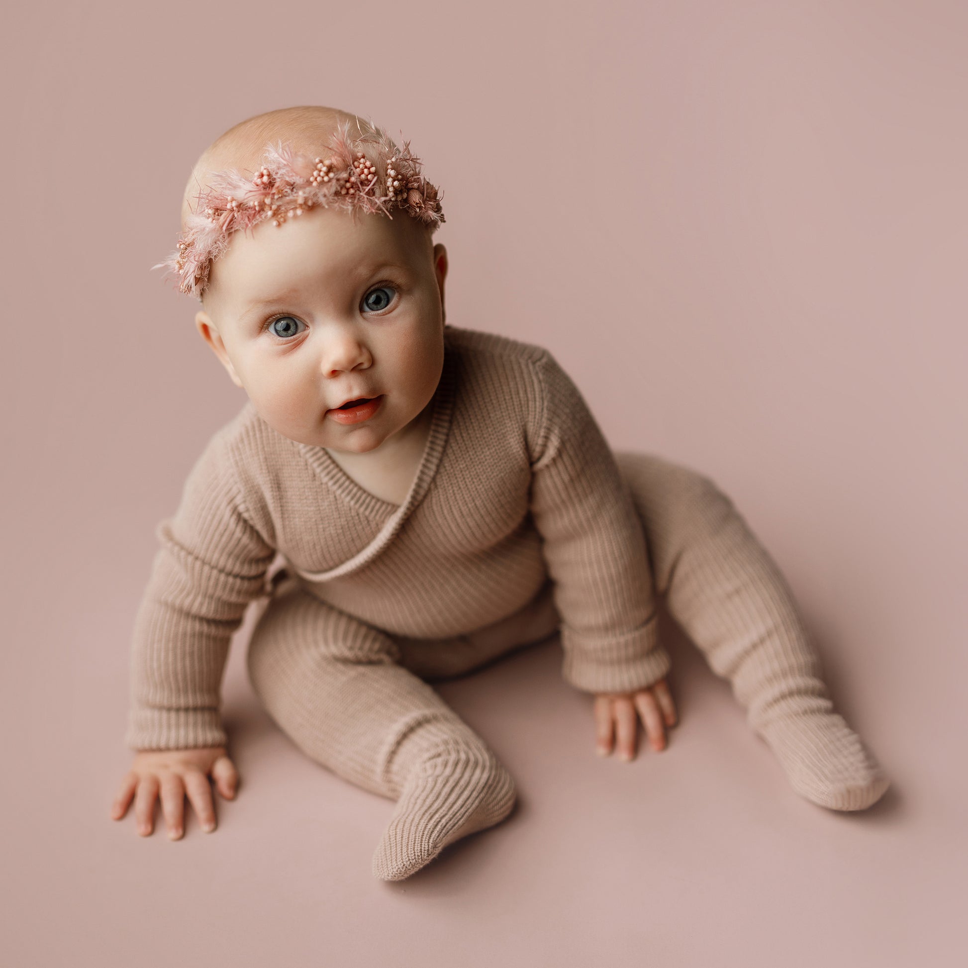 Available in a curated range of colors, the Ryker | Footie effortlessly blends with your favorite props and backdrops, making it a go-to choice for timeless, organic baby portraits.
